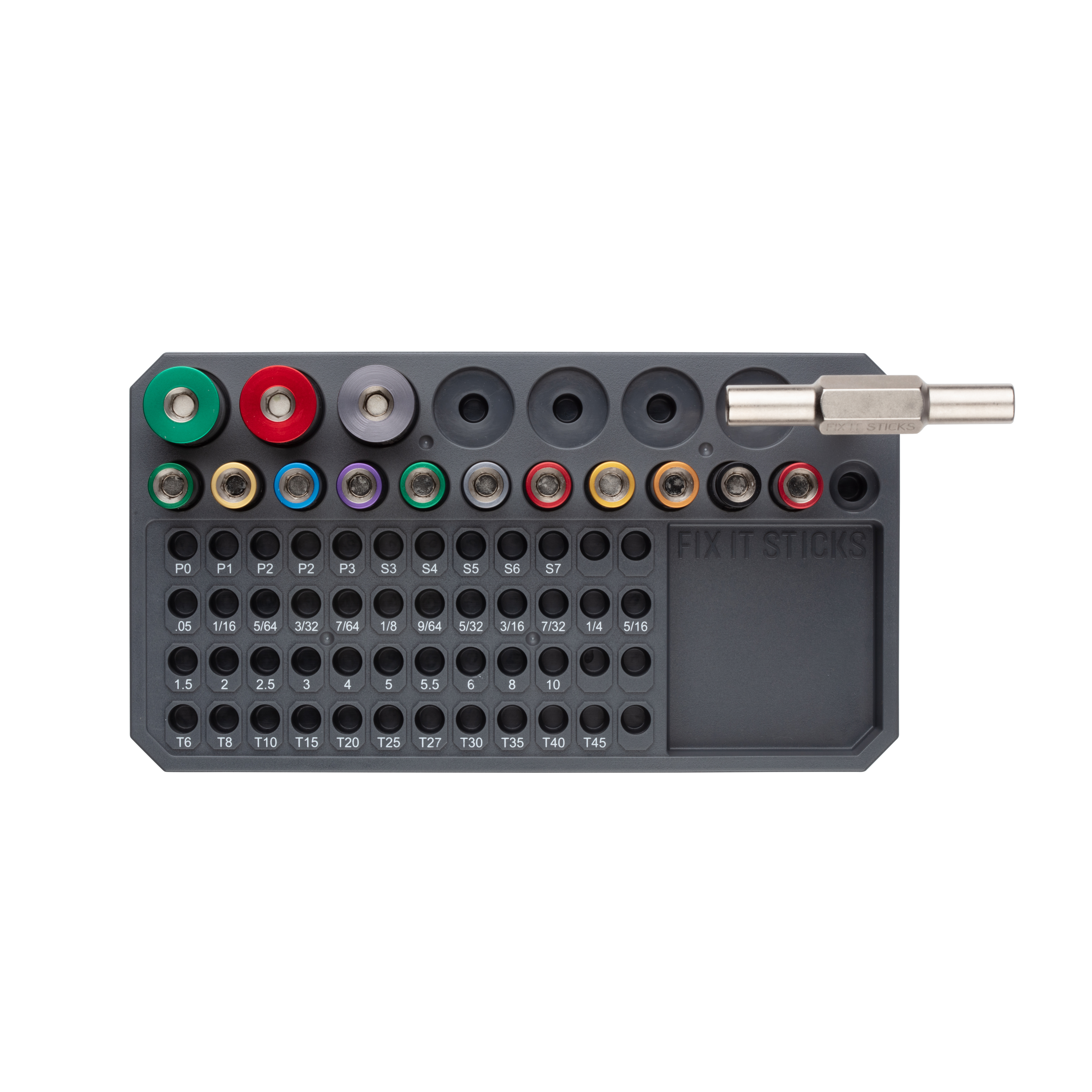 - Molded Plastic Storage Base that holds T-Handle, Nineteen Torque Limiters, and Forty-Eight 1/4" Bits.